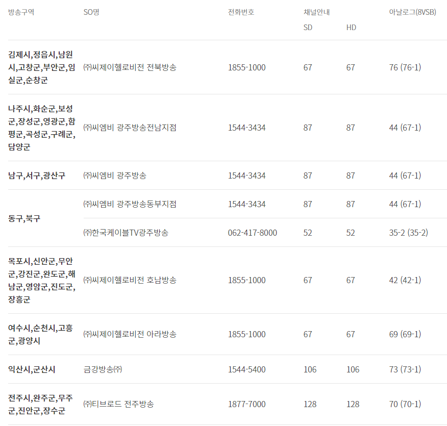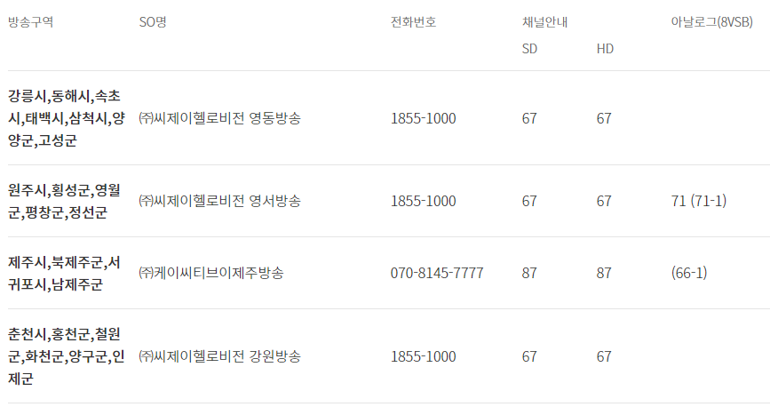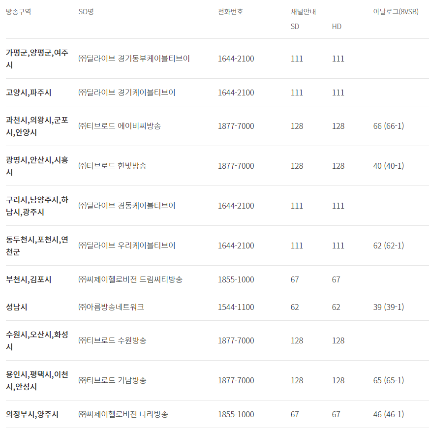 지역케이블 티비 방송사의 고객센터번호도 있으니 참고하세요
