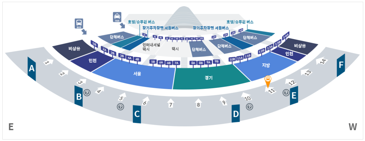 1터미널은 1층11번 탑승장, 2터미널은 교통센터 지하1층 4번 탑승장입니다.