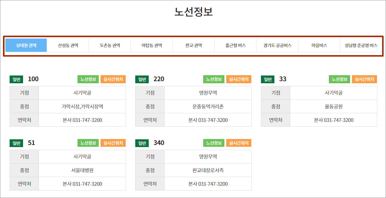 아래는 성남시내버스 홈페이지에서 제공하고있는 권역별,버스종류별(출근형,공공버스,마을버스 등) 버스 노선정보 및 실시간 위치를 확인할수 있는 페이지입니다.