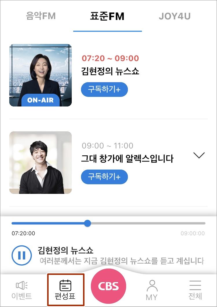 어플 실행후에 하단부에 '편성표' 를 선택하신후 '표준FM' 탭을 눌러서