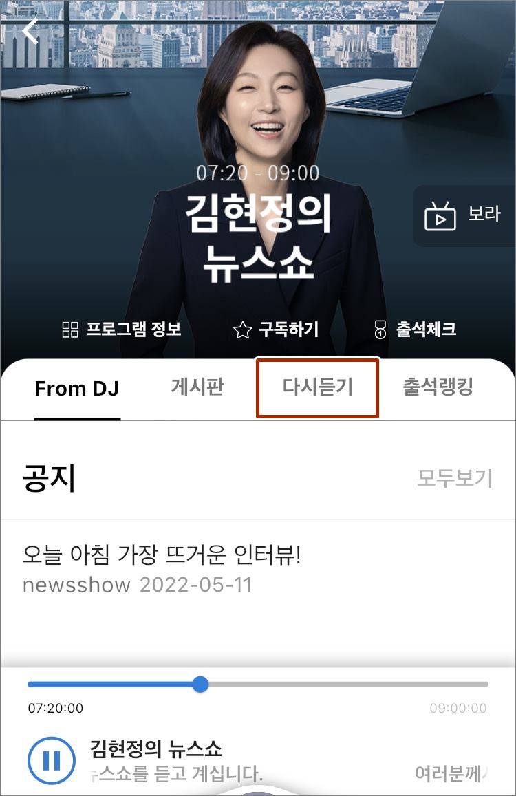 '다시듣기' 메뉴를 선택하시면 지난 방송을 다시 들으실수 있습니다.