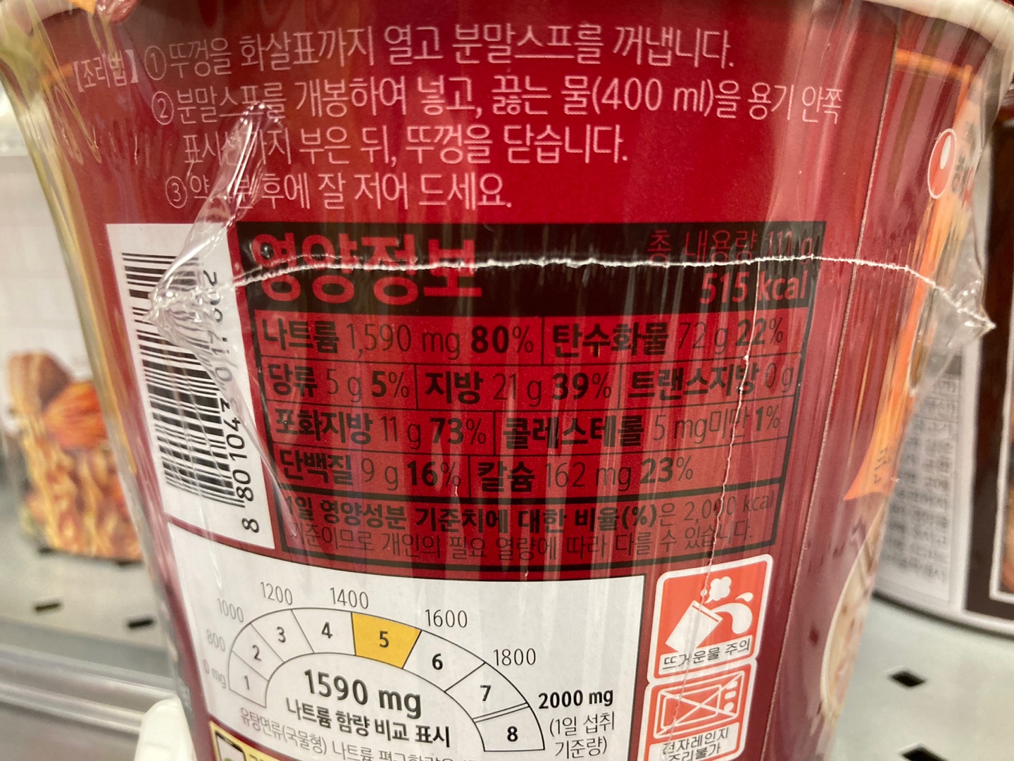 영양성분 - 총중량(111g), 나트륨(1,590mg), 탄수화물(72g), 당류(5g), 지방(21g), 트랜스지방(0g), 포화지방(11g), 콜레스테롤(5mg), 단백질(9g), 칼슘(162mg)